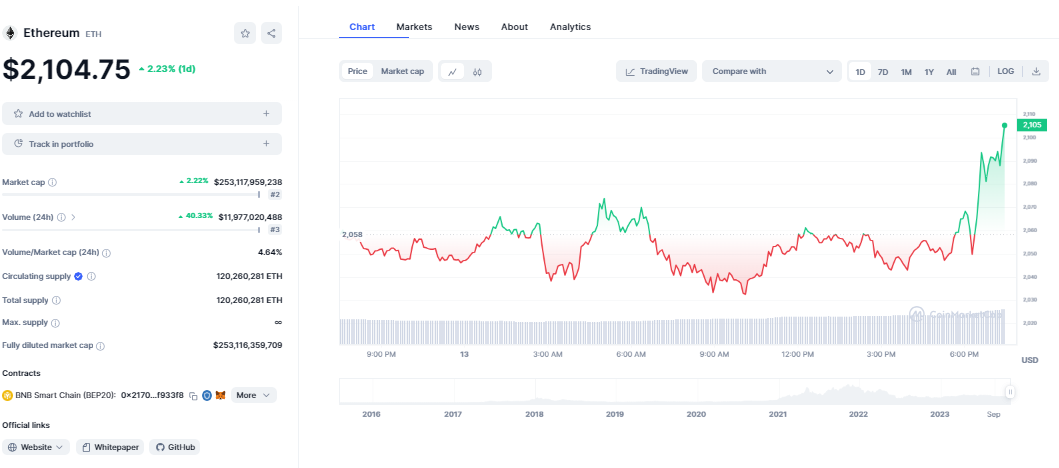 بنابراین برای بررسی قیمت لحظه‌ای اتریوم، بهتر است از وبسایت‌های جامع ردیابی قیمت نظیر تریدینگ ویو (tradingview.com) یا کوین مارکت کپ (coinmarketcap.com) استفاده کنید. به استناد کوین مارکت کپ، قیمت اتریوم به دلار در حال حاضر در آبان 1402 در محدوده 2,104 دلاری قرار دارد.