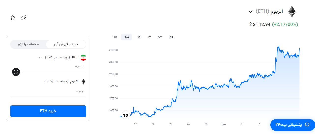 بنابراین راه بهتر و جایگزین، استفاده از یک صرافی رمز ارزی ایرانی نظیر بیت24 است که قیمت روز اتریوم به تومان را به‌صورت لحظه‌ای به شما نشان دهد. شما با مراجعه به صفحه اتریوم در بیت 24، علاوه مشاهده قیمت لحظه‌ای آن به دلار و تومان، می‌توانید چارت قیمت آن را نیز بررسی کرده و تغییرات آن طی 24 ساعت گذشته را تحلیل کنید: